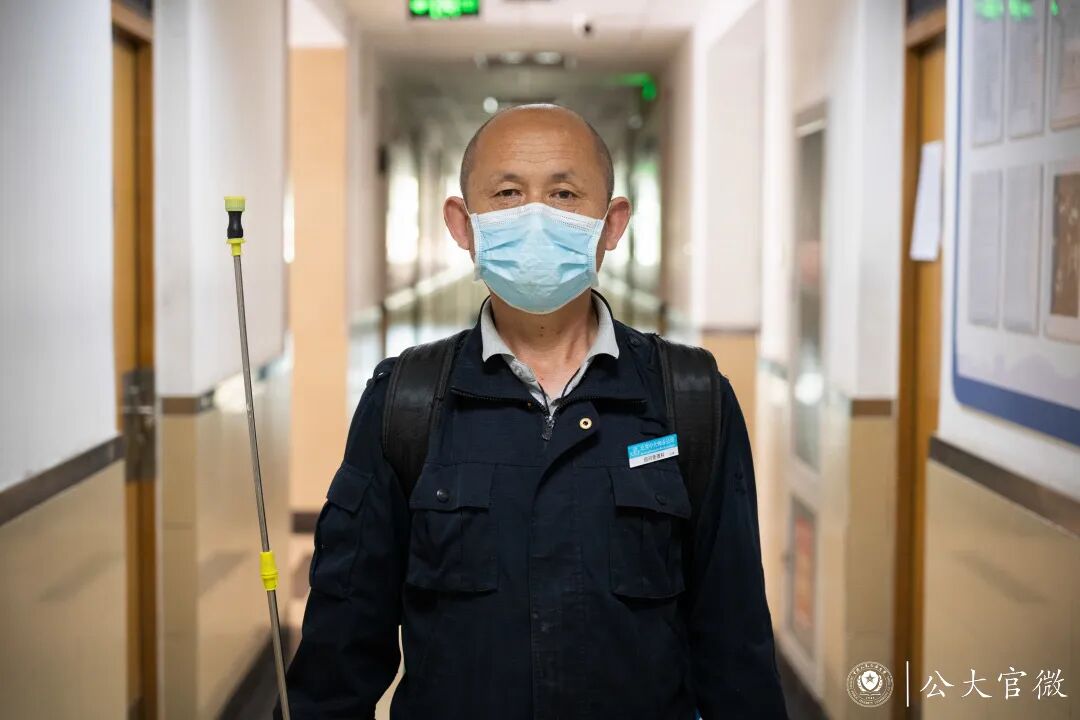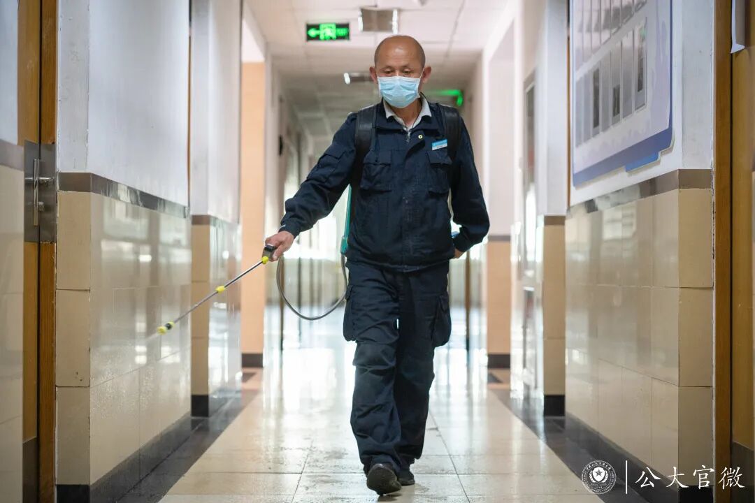 The daily work scope of our disinfecting is the dormitory building of each student, mainly in public areas, such as corridors, stairs, bathrooms and police space. Through the two daily disinfecting work, we strive to provide a clean and hygienic environment for teachers and students of the school. As a veteran, I am willing to give up the small family for everyone to help resist the overall situation with actual actions.