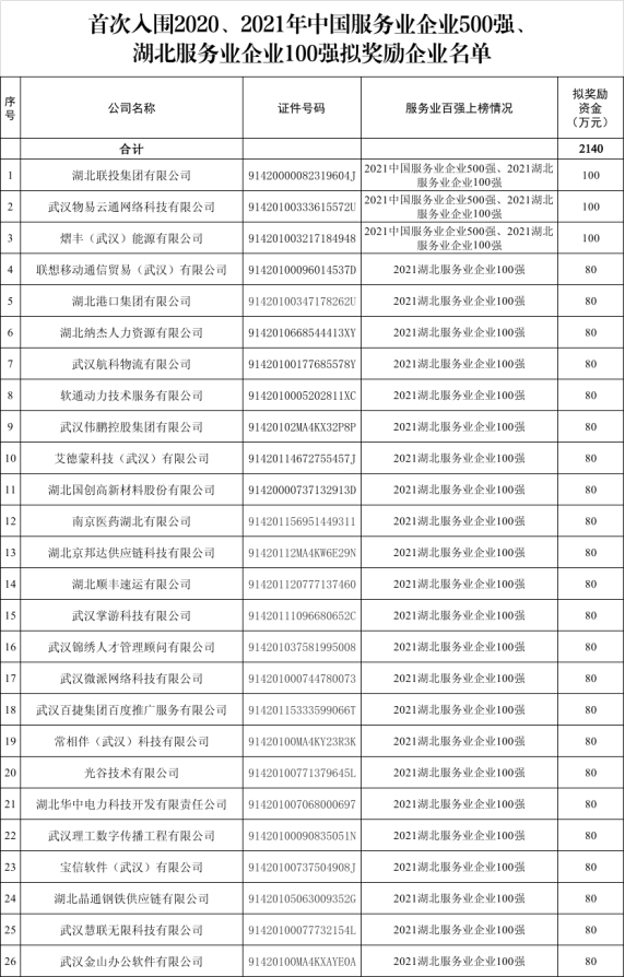 Top 100 companies in Hubei Service Industry Enterprises intend to reward list