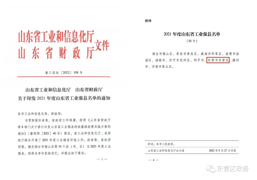 A few days ago, the Provincial Department of Industry and Information Technology and the Provincial Department of Finance jointly issued the \"Notice on Printing and Distributing the List of Industrial -strong County in Shandong Province in 2021\". City, district).
