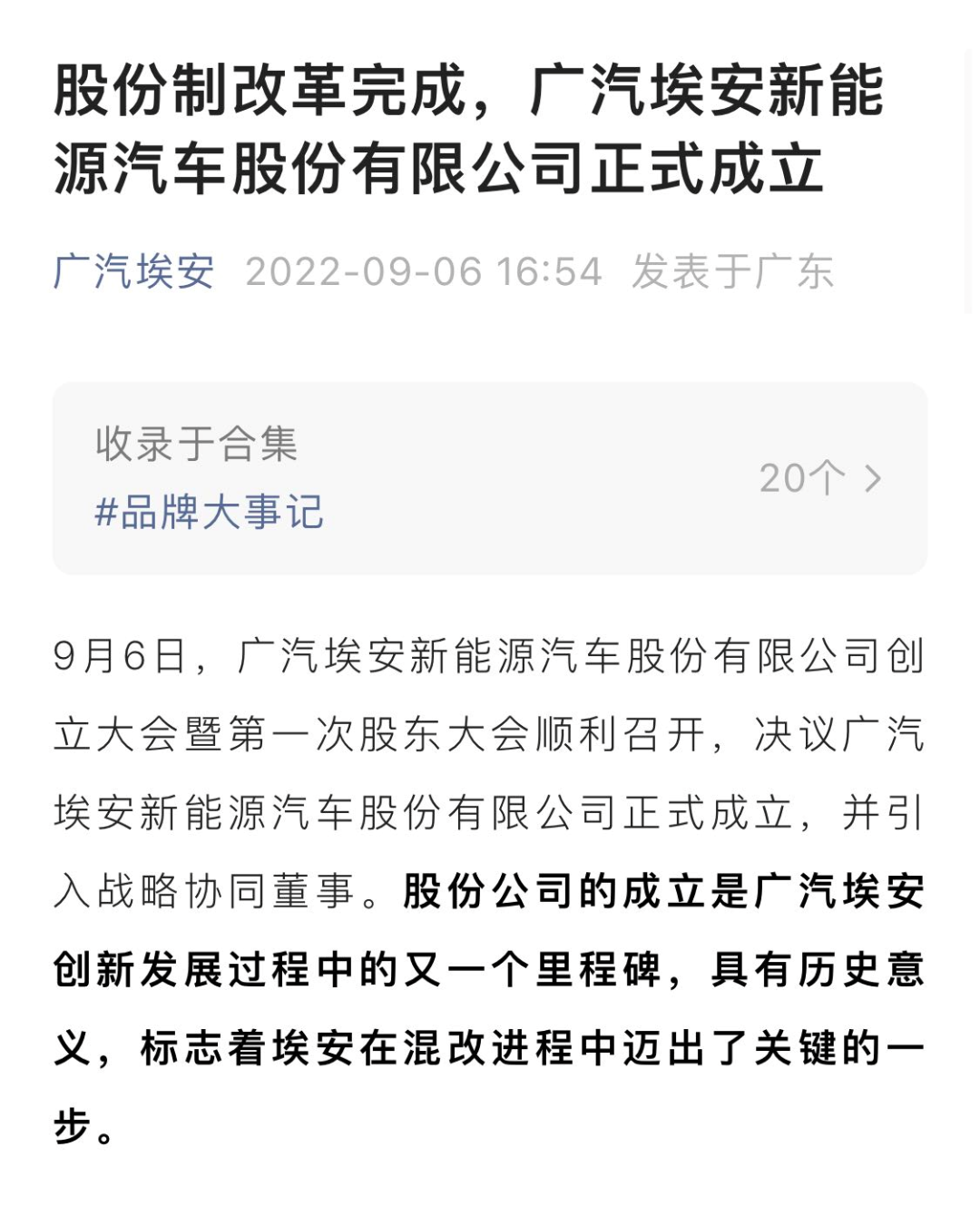 GAC Ean said that the establishment of a joint -stock company is a milestone in the process of innovation and development of the company, marking a key step in Ean in the process of mixed reform.