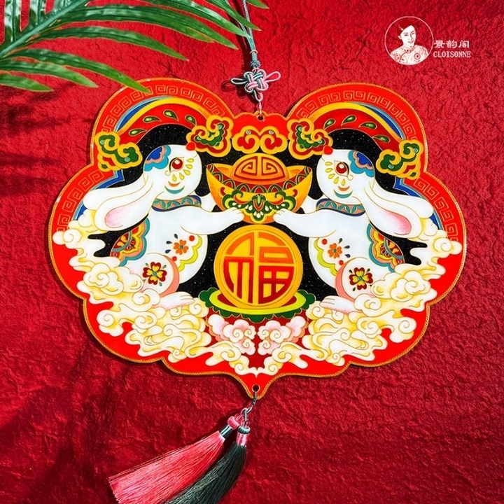 The two rabbits were sitting on the Xiangyun, holding Jin Yuanbao, and the ingots decorated with bats, which means that the wealth is rolling and the blessing. Below the ingots is the word "blessing" in the Jubao pot, which means that the blessing is full. This is the "Ruyi Rabbit" of Jingtai Lan's silk enamel plane. The yellow bottom plate of Ruyi is matched with the tassel decoration. It can be suspended for a pendant, or it can be mounted into the frame for decorative paintings.