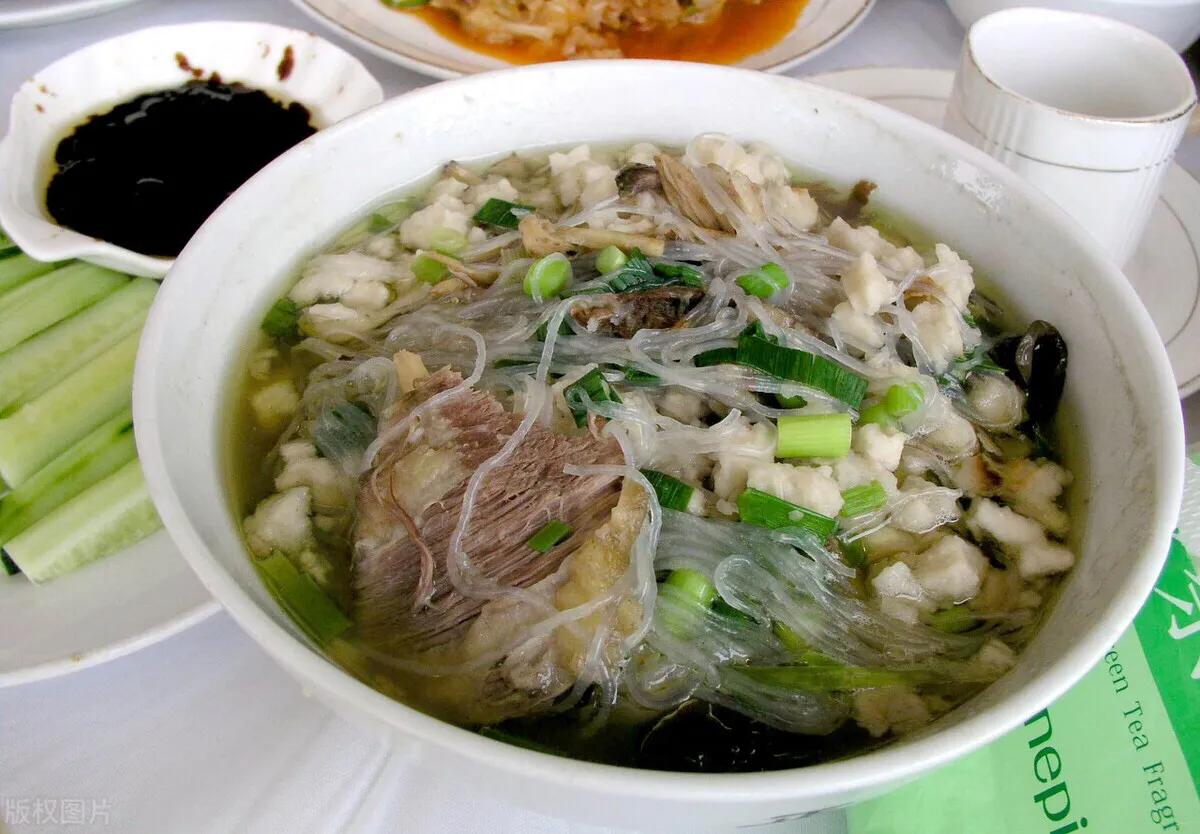 4. Then remove the stewed mutton and lamb bone, and then add the soaked fans and fungus to cooked, put it into the bowl, pour the lamb soup, add lamb, sprinkle with green onion, and finally drizzle with sesame oil. ate