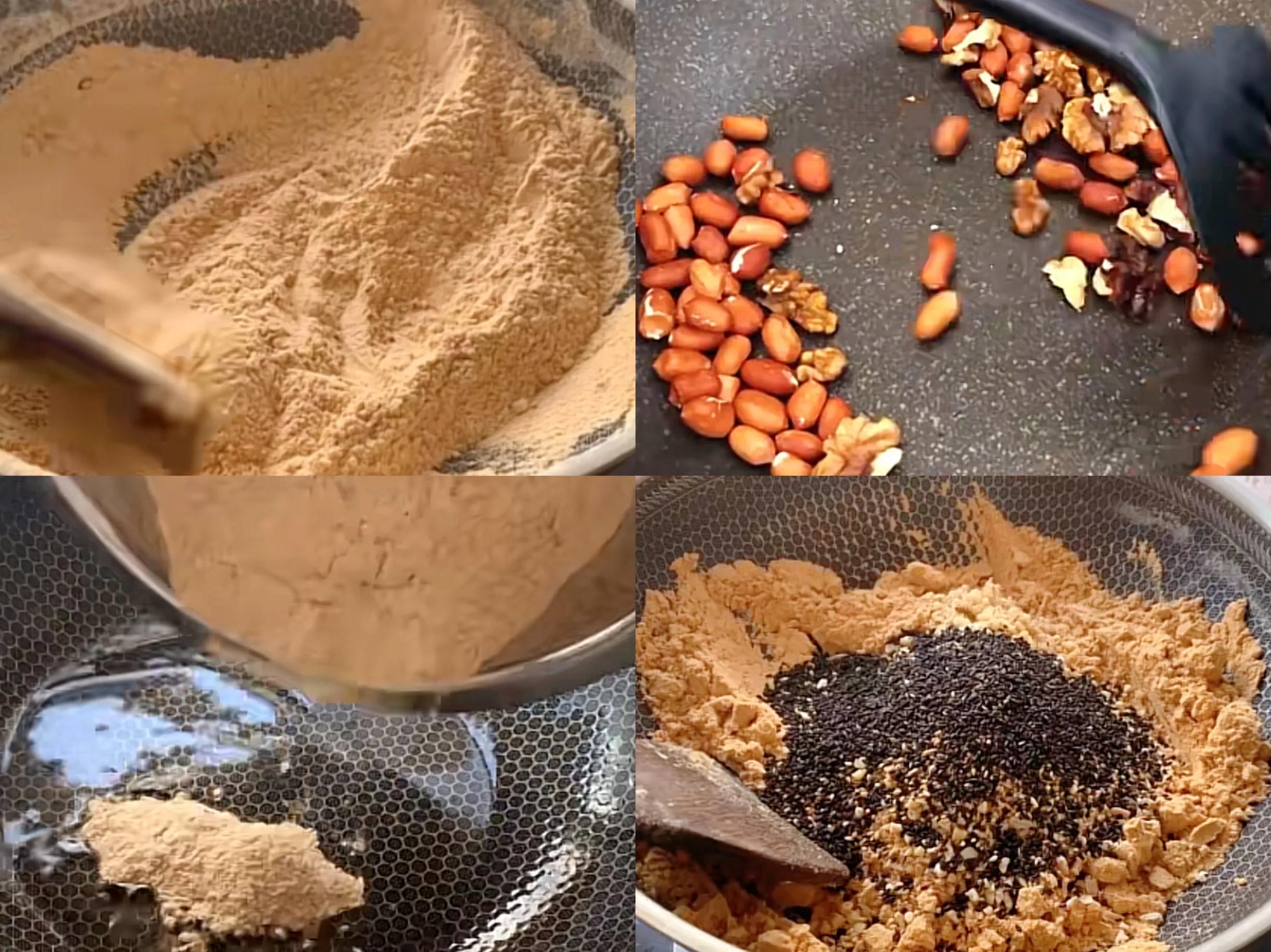 (1) Pour a large bowl of flour directly in the pan, stir -fry the low heat, fry it into caramel color, and have a strong grain fragrance. After cooling, sieve it. Go on