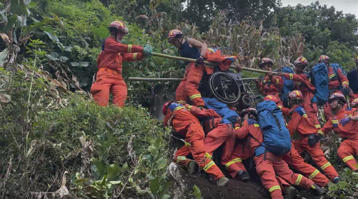 Tears!The earthquake was interrupted from the village road, and the firefighter took the "bridge" to transfer the paralyzed elderly
