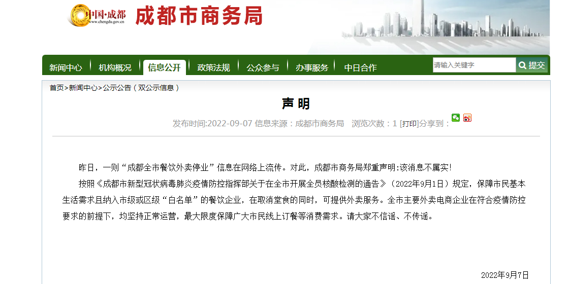 The Chengdu Commercial Bureau stated: The news of "Chengdu's catering and takeaway" is not true!