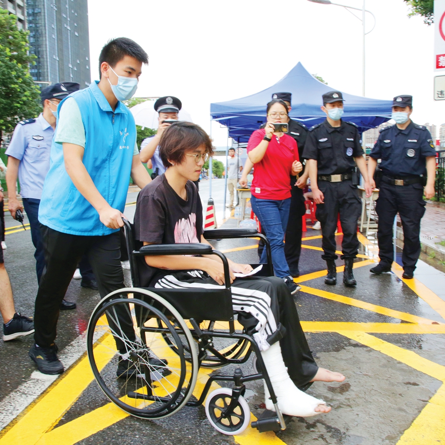 At 7 am, outside the test site of the Municipal Guangzheng Experimental School, the Municipal Public Security Bureau set up a convenient service site for college entrance examinations to organize traffic police, special police, household administration and other police forces to diligence outside the field to protect the safety and order around the examination room. On the left side of the school gate, the \"warm heart assistance\" college entrance examination volunteer service point provides candidates and parents with love materials such as masks, disinfectants, emergency drugs, umbrellas, stationery, etc., and ensure the guarantee of college entrance examination services.