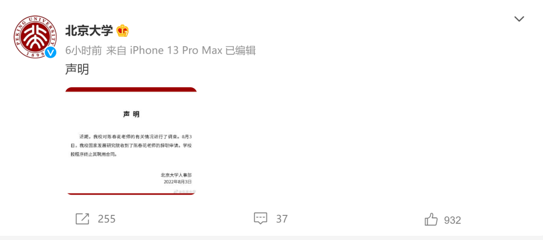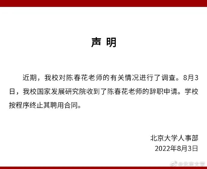 On August 3, the official Weibo of Peking University issued a statement saying that the school recently investigated the relevant situation of Mr. Chen Chunhua. On August 3, the school's National Development Research Institute received an application for resignation from Mr. Chen Chunhua, and the school terminated its employment contract according to the procedure.
