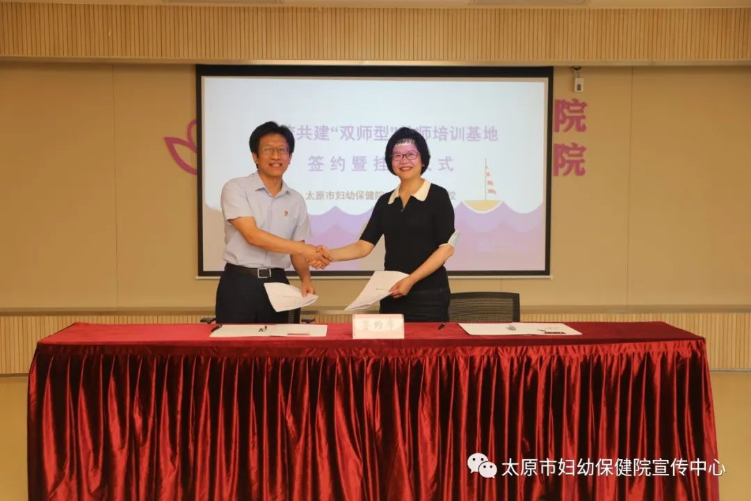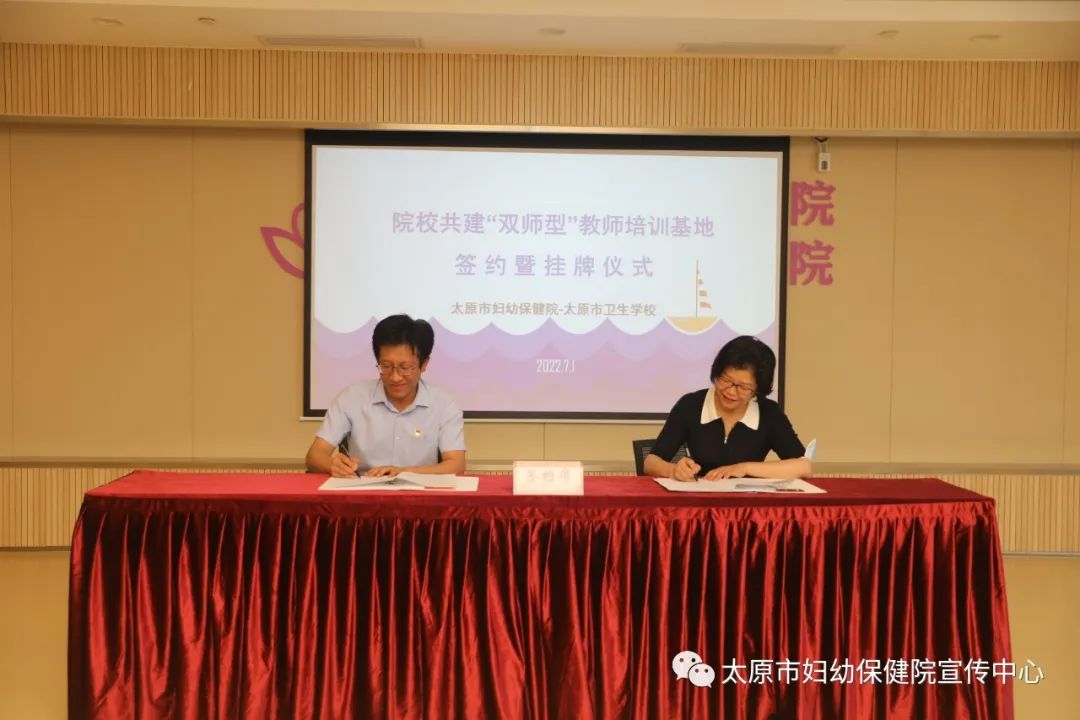 On July 1st, 7 people including Taiyuan Health School President Xi Hongyi, Party Secretary Cai Shichen, Vice President Wang Yu, Guo Weibin, and Chief of Academic Director Wang Qiyue, etc., came to Taiyuan Maternal and Child Health Hospital to jointly build a "dual -teacher type "Teacher training base signing and listing ceremony. The leadership of the Taiyuan Maternal and Child Health Hospital and the director of the relevant functional departments attended the ceremony, and Zheng Yanmei, deputy dean, served as the host.