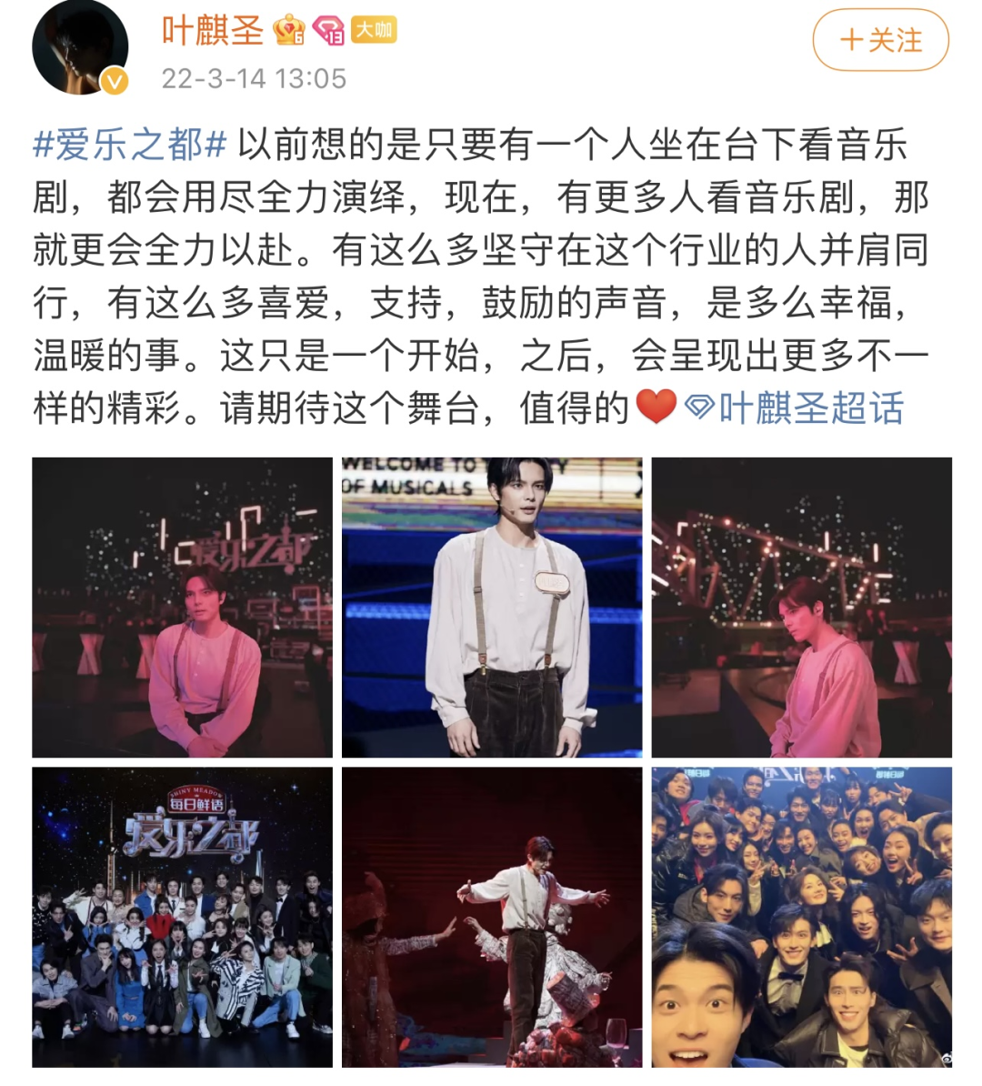 In the meantime, the 1st post on the 1st not only believes that "the Chinese musical actors who collectively appeared in front of the Chinese public, using an outside world to show the most elegant art, show the most bloody side of the idol in the new era." At the same time By the time, "compared to the impetuous mass culture, the musical actor retains pure and quaint artist spirit."