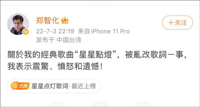 According to the news of the "021 video" of the News Morning News, the "boiling point" reported that Lawyer Huang Xiong said that according to the Copyright Law, the copyright of the adaptation of the work must not infringe the copyright of the original work. The lyrics and compositions of "Star Lights" are Mr. Zheng Zhihua, who enjoys the right to modify, adaptation of the work, and the right to protect the works that are not distorted and tampered with.