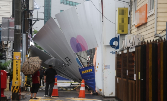 On the 8th local time, after the wind and rainstorm, the shielding board at a construction site in the Central District of Seoul fell, and the police said it did not cause casualties to be casualties.
