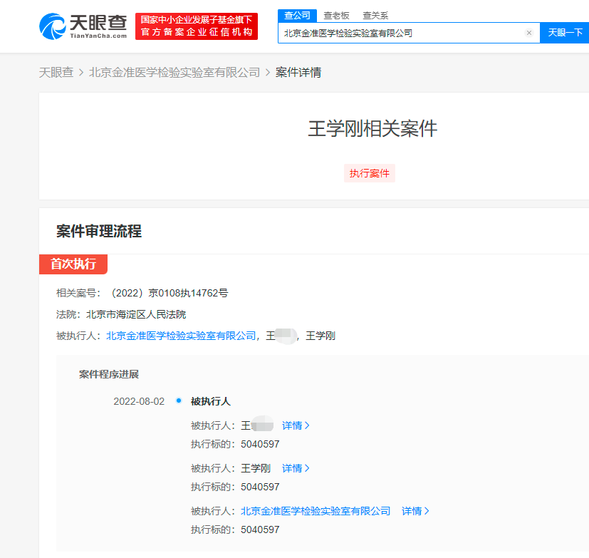 The Tianyan Check APP shows that recently, Beijing Golden Medical Inspection Labs Co., Ltd. and the legal representative Wang Xuegang and another natural person Wang have added information to the executive person, and the implementation of more than 5.4 million yuan. Essence