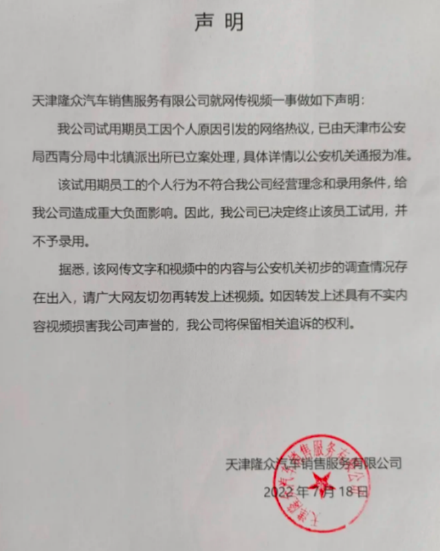 Tianjin Longzhong Automobile Sales Service Co., Ltd. made the following statement on the Internet Video: Heated Internet discussions caused by personal reasons for employees of our company's trial period have been filed by the Tianbei Town Police Station of the Xiqing Branch of Tianjin Public Security Bureau. The public security organs are notified.