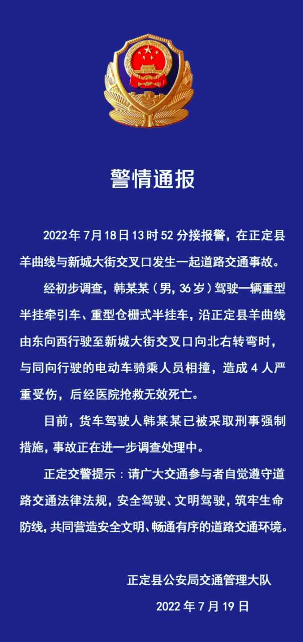 On July 18, a traffic accident occurred in Zhengding County, Shijiazhuang County, Hebei. When the monitoring took a large truck, he turned right and knocked down a two -wheeled electric vehicle, causing four people on the electric vehicle to die. On the 19th, the local police issued a notice saying that the truck driver Han Moumou had been taken criminal measures.