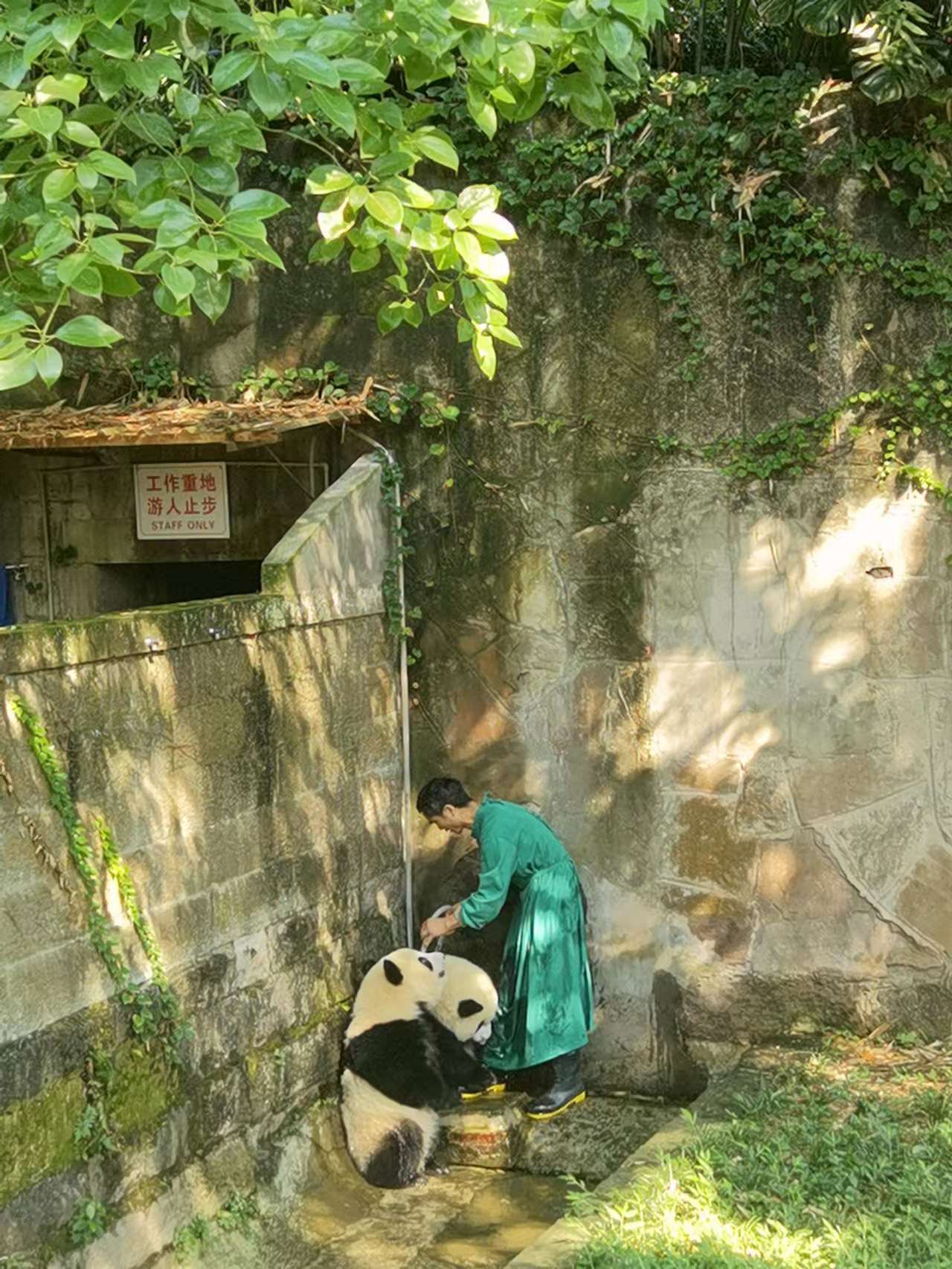 "It's really interesting! Panda is very clever, knowing that he takes a water pipe to take a shower!" "Public Welfare Ambassador" Zhou Yangui said excitedly that he especially liked giant pandas because the giant panda is the national treasure of China, which represents the representative of the Chinese treasure. It is the image of China. Another "public welfare ambassador" Feng Yanling also laughed and said that she had seen big pandas in the picture before, and her appearance was really cute, but I did not expect that the giant panda would be so sticky and like her breeder so much. " Seeing the twin pandas rushing to take a bath, it's really cute! "