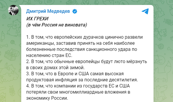 In response to the current situation of Russia and Ukraine, Medvedev has also repeatedly issued a response on social media. On July 21, he issued a post to ridicule Western leaders to cover up his mistakes by accusing Russia and compile the "11 crimes" of Western countries, including: European and American countries have repeatedly renewed high and fooled European "fools "We" bear the consequences of sanctions against Russia, European people will suffer severe cold this winter ...