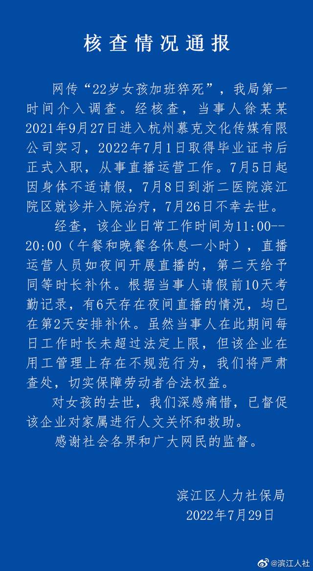 The online "22 -year -old girl died suddenly", and our bureau involved in the investigation as soon as possible. After verification, the parties Xu Moumou entered Hangzhou Muk Culture Media Co., Ltd. on September 27, 2021. After obtaining the graduation certificate on July 1, 2022, he was officially joined and engaged in live operation. Starting from July 5th, he took leave for his physical discomfort. On July 8th, he went to the Binjiang Hospital of Zhejiang Second Hospital and was admitted to the hospital for treatment. He died unfortunately on July 26.