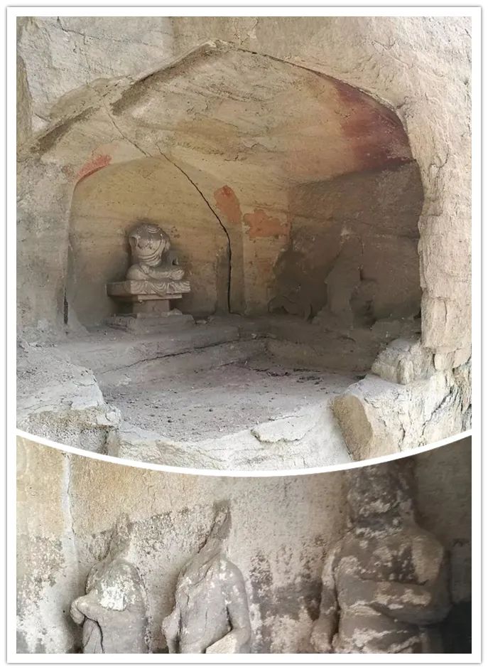 The two existing grottoes, the west direction grotto due to severe damage, the Buddha statue of the three nobility has only left some traces; only two sidelines were left in the east (one of the rocks have fallen due to the broken rock), and a stone statue of a stone Buddha in the middle (has already existed (already Headless), 0.74 meters high, 0.5 meters wide. It is a puppet statue for the right shoulder of the dew, the sculpting method is straight stepped, and the Buddha seat is the back of the back lotus beam of the waist. Essence Only the two caves are open -shaped, and the top is dome, which is a typical one cave three -龛. Judging from the existing relics, there are traces of giving.