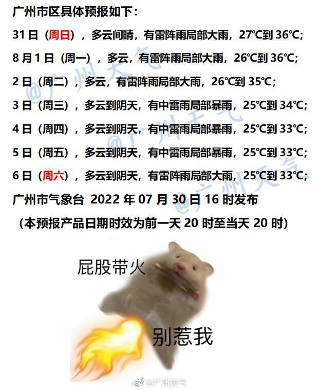 From July 31st-August 1st, most of the sunny clouds in Guangdong Province are mainly cloudy, and most cities and counties have local heavy rain or heavy rain in the afternoon. The highest temperature: 31 ° C to 33 ° C in the southern coastal cities, 34 ° C to 37 ° C in the remaining cities and counties, and local 38 ° C.