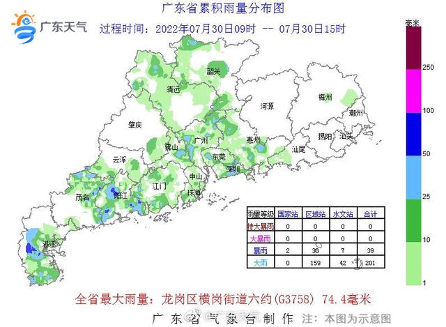 According to meteorological and hydrological monitoring, from 09:00 on July 30 to 15:00, the average rainfall of Guangdong Province was 2.9 mm, and more than 25 mm town streets accounted for 8.6%of the province's total town street. There are 102 town streets recorded 25 mm to 50 mm heavy rain in 102 town streets.
