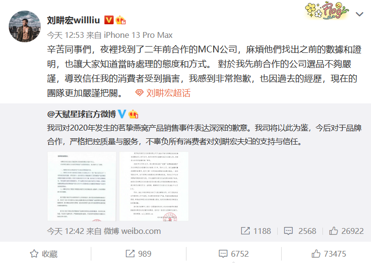 On August 30, Simba issued the news that Liu Genghong had sold "fake bird's nest". At noon August 31, the company where Liu Genghong was located issued an apology statement on the official Weibo "Talent Star Official Weibo", saying that the cooperative company did recommend the bird's nest product for sale in the live broadcast. Whether the sale is the same batch of products with other problems with other problems, it has now required and urged the cooperative company to properly handle the above incidents and refund the compensation for consumers in accordance with the law. Subsequently, Liu Genghong reposted an apology: "I am not strict enough for the company I have cooperated before, leading to damage to my consumers who trust me. I am very sorry. Because of the past experience, the team is more rigorous."