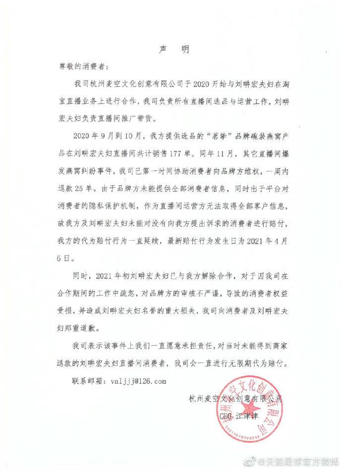On the same day, Hangzhou Wheat Air Corporation also issued a statement saying that from September to October 2020, the company's selected bird's nest products sold a total of 177 orders in Liu Genghong's live broadcast room. In November of the same year, other live broadcast rooms exposed bird's nest disputes. The company had assisted consumers to repay the brand Fang, and refunded 25 orders within a week. For the company's negligence during the work period, the review of the brand's party is not rigorous, the consumer rights are damaged, and the company's reputation of the Liu Genghong couple has a major loss of reputation. For the Liu Genghong couples who were not refunded by the merchant at the time, the company would always pay the invalid period for compensation.