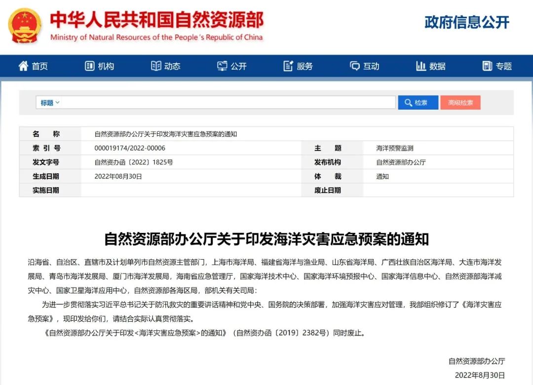 The "Plan" requires that relevant units and other relevant units of the Ministry of Natural Resources shall strengthen the operation status of marine observation prediction equipment and data transmission systems to ensure the timely transmission and sharing of marine observation data. When the instrument and equipment or transmission system fails, each unit shall report and try to repair step by step in time. The competent department of natural resources (marine) of the coastal provinces (autonomous regions, municipalities) shall refer to this plan, combine local needs and reality, organize the formulation of emergency plans for marine disasters of the province (autonomous region, city), and to the Ministry of Natural Resources and the provinces (districts and municipalities (districts and municipalities (districts and municipalities ) The competent department of emergency management will be recorded.
