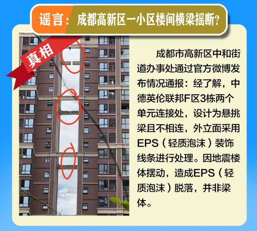 According to the official Weibo of Zhonghe Street Office in Chengdu High -tech Zone, Sichuan Province, it is understood that the connection between the three units of the three units of the China and Germany F District is designed as a cantilence beam and is not connected. Decoration lines are processed. Due to the swing of the earthquake building, EPS (light bubble) falls off.