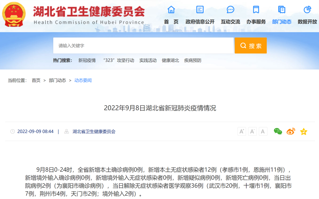 Just now, the official website of the Hubei Provincial Health and Health Committee released the "September 8, 2022, Hubei Province's New Crown Pneumonia's Epidemic", as follows: