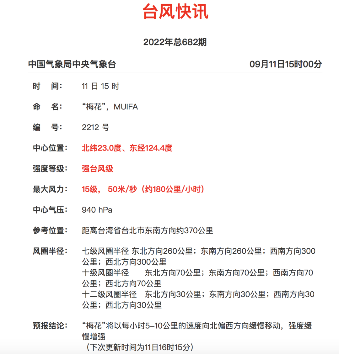 The Central Meteorological Observatory issued a typhoon blue warning at 6 o'clock on September 11. Typhoon "Plum Blossom" No. 12 this year was strengthened to a strong typhoon this morning. It is expected that "plum blossoms" will move northwest at a speed of 5-10 kilometers per hour, and the intensity will gradually increase.