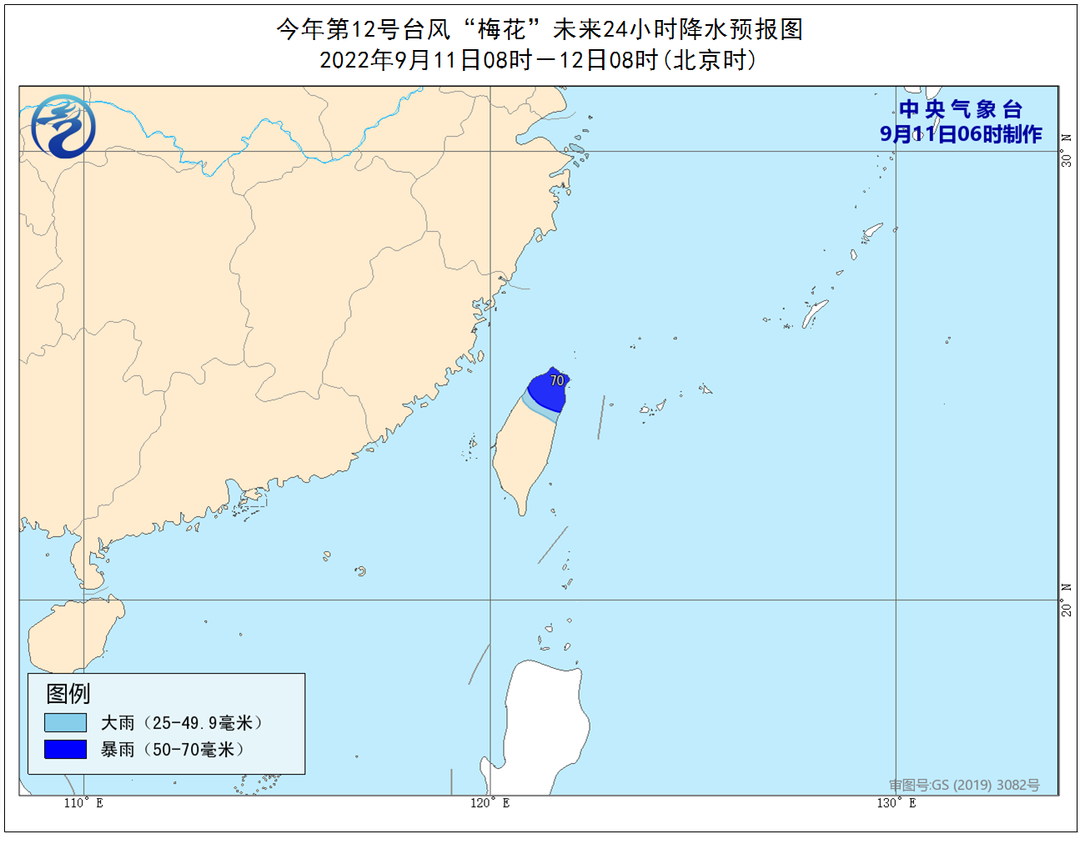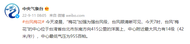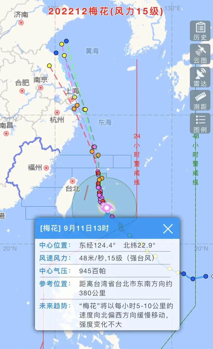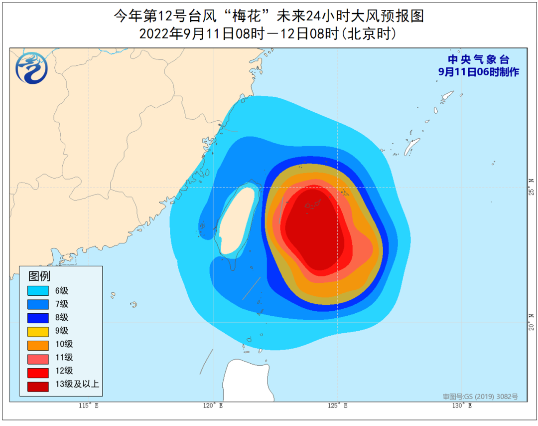 From 08:00 on September 11th to 08:00 on the 12th, the southern sea surface, the Taiwan Strait, the east of the Taiwan Ocean, the bus strait, the coast of the Taiwan Island of my country, and the sea near the Diaoyu Islands have 6-7 strong winds, and the gusts are 8-9; the southeast of the East China Sea; There are levels of 8-11 in some waters in the seas of the ministry and east of Taiwan. The wind in the nearby sea and regions passed by the "Plum Blossom" center is 12-15, and the gusts can reach level 16.