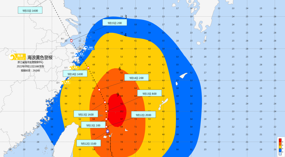 The maximum is likely to land on the night of the 14th to 15th or wipe over Zhoushan to the coast of Ningbo. The Provincial Meteorological Observatory has issued a typhoon alert on the 12th.