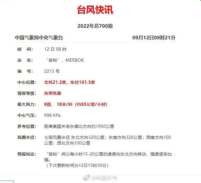 At 8 am on the 12th, Typhoon "Miao Bai" was generated on the 13th. The center was located at 21.2 degrees north latitude, 161.3 degrees east longitude, level 8 (18 meters/s), 998 hundred Pache, and the seven-level wind ring radius was 100-320 kilometers. It is expected that "Miao Bai" will move northeast at a rate of 15-20 kilometers per hour, and the intensity will gradually strengthen. In the future, "Miao Bai" has no impact on our province.
