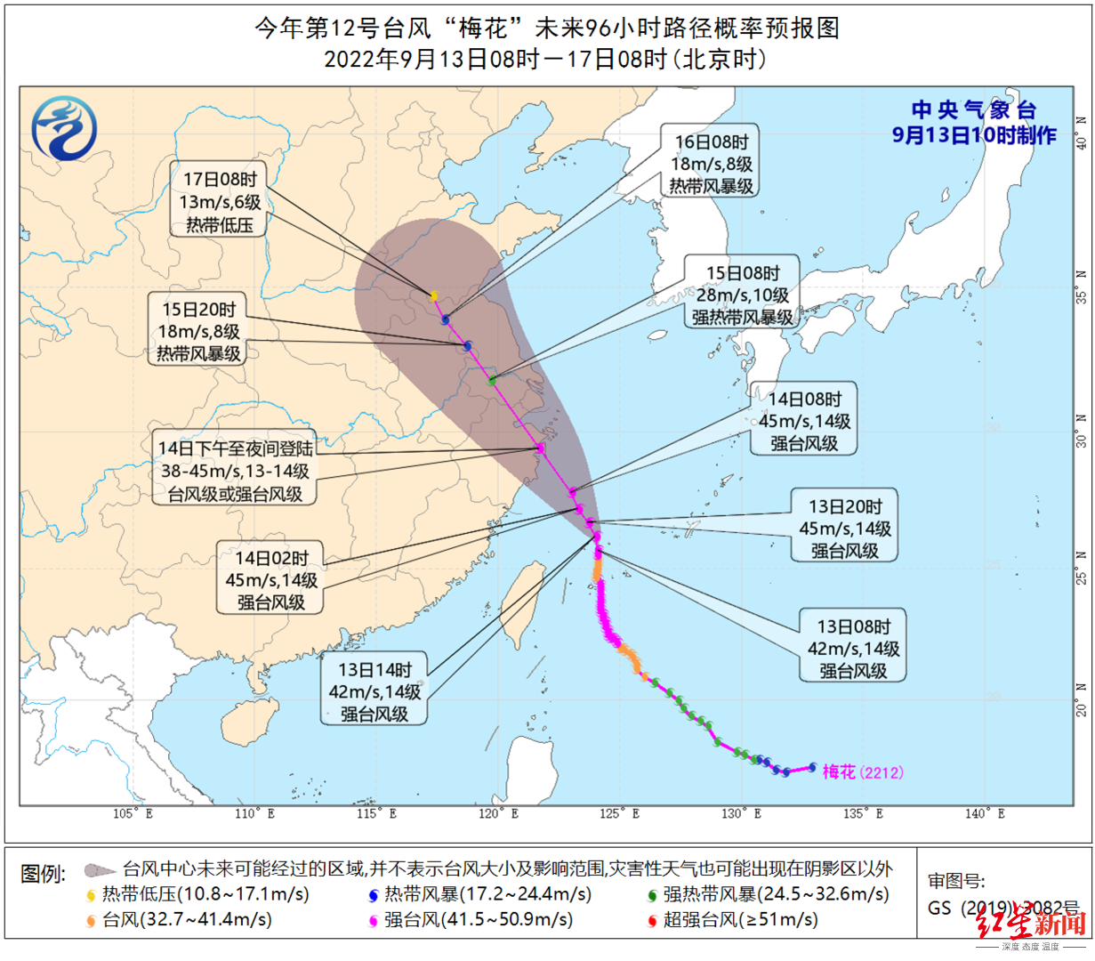 According to the China Meteorological Administration's report, "Plum Blossom" has been strengthened to a strong typhoon level at 5 am on September 13th. It is highly likely to land on the coast of Wenling from Wenling from Zhejiang to the evening of the night on the 14th. Strong typhoon level.