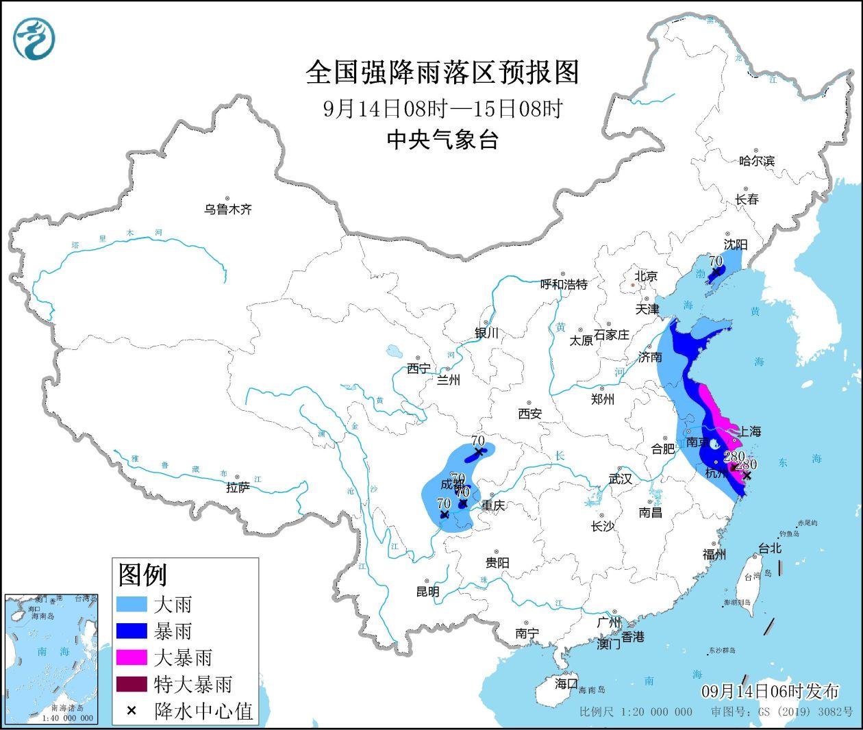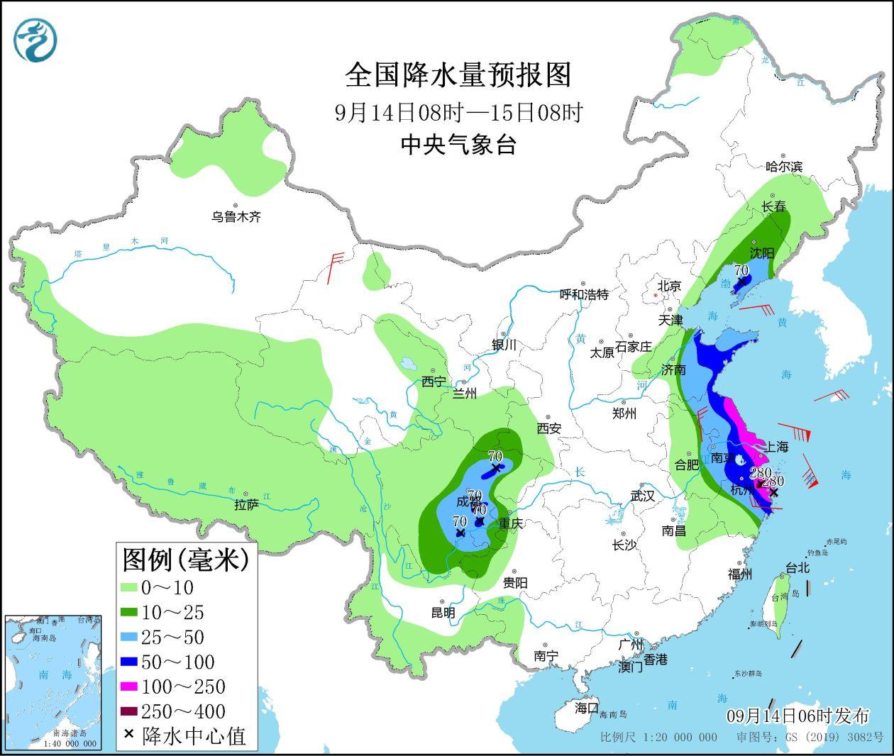 It is expected that from 08:00 on September 14th to 08:00, Liaodong Peninsula, central and eastern Shandong, Shanghai, Jiangsu, eastern Zhejiang, central Zhejiang, central and western Sichuan Basin and other areas will be as large as heavy rains. There are heavy rains in parts of Shanghai, northeast Zhejiang, etc., and heavy rainstorms in the northeast of Zhejiang (250-280 mm). The above -mentioned areas are accompanied by short -term and heavy precipitation (the maximum hourly rainfall is 30 to 60 mm, and the local area can exceed 70 mm). There are strong convective weather such as thunderstorms and winds. The Central Meteorological Observatory continued to issue heavy rain yellow warning at 06:00 on September 14 (see Figure 2).