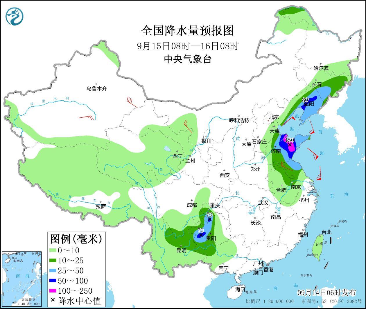 From 08:00 on September 15th to 08:00 on the 16th, there are medium to heavy rain in eastern Jilin, Liaoning, Shandong, central Jiangsu, eastern Anhui, southeast of Sichuan, western Guizhou, northeast of Yunnan, northwestern Guangxi, among them There are heavy rain or heavy rain (100-150 mm) in central Liaoning, central Shandong, and western Guizhou. There are 4-6 or above winds in the northwest of Inner Mongolia, the South Xinjiang Basin, and the northern part of Jiangsu. The southwind, the Bohai Sea will have 5-7 and the northeast wind of level 8 and the 8th gust 8 (see Figure 4).