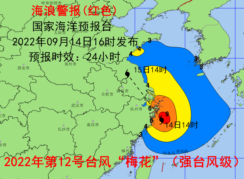 Affected by the typhoon "plum blossoms", it is expected that from the night of September 14 to the day of the 15th, 6 to 10 meters of wild waves will appear in the south of the East China Sea to the wild wave area. Area, the warning level of the waves of offshore waters is orange;