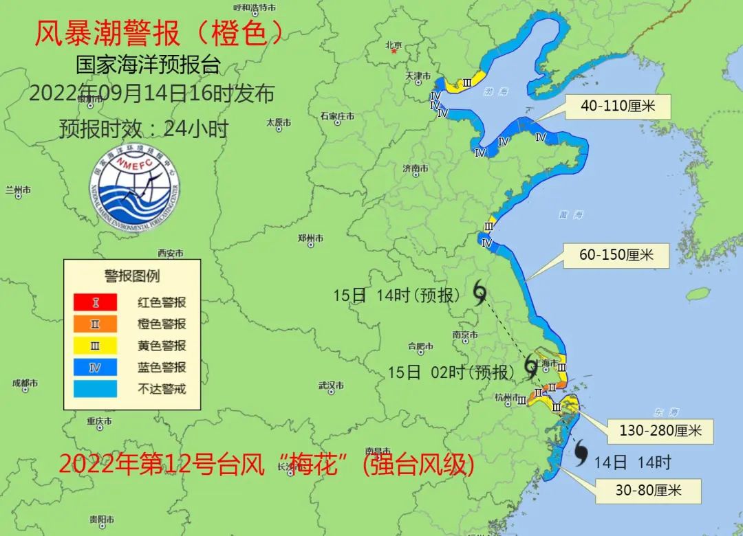 It is estimated that from the afternoon of September 14th to the afternoon of the 15th, 40 to 110 cm of storms will occur from the coast of Liaoning to the northern coast of Shandong Peninsula. The storm of 130 to 280 cm in Ningbo in Zhejiang will increase water from 130 to 280 cm, and 30 to 80 cm of storms in the coast of Taizhou in Zhejiang will increase water.