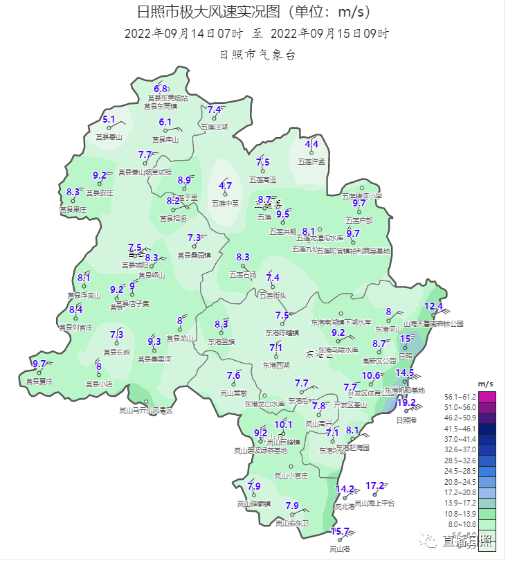 From 07:00 on September 14, 2022 to 09:00 on the 15th, the city's great wind speed was 19.2m/s (level 8), and at 13:00 on the 14th, at Rizhao Port.