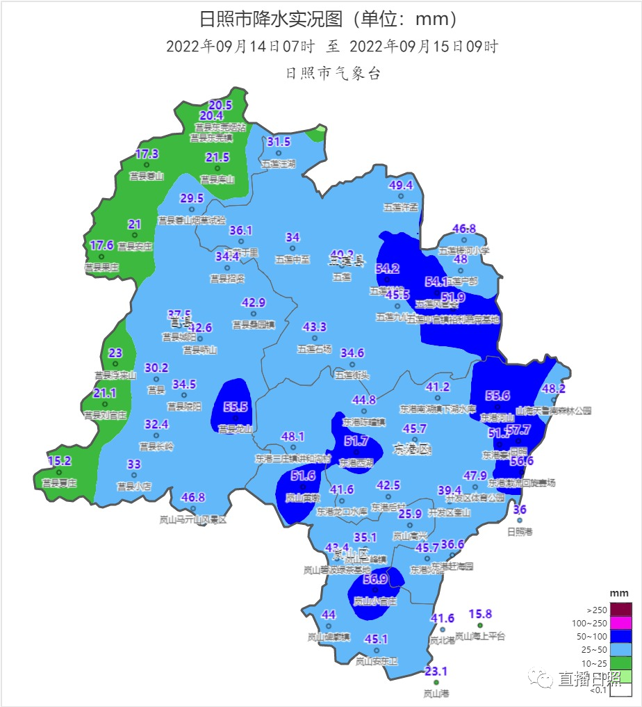 The average precipitation in each district and county is as follows: Donggang District 46.7 mm, 41.9 mm in Lanshan District, 28.9 mm in Jianxian County, 37.2 mm in Wulian County, 43.7 mm in the opening area, 50.3 mm in high -tech zones, and 50.9 mm in Shanhai Tian.