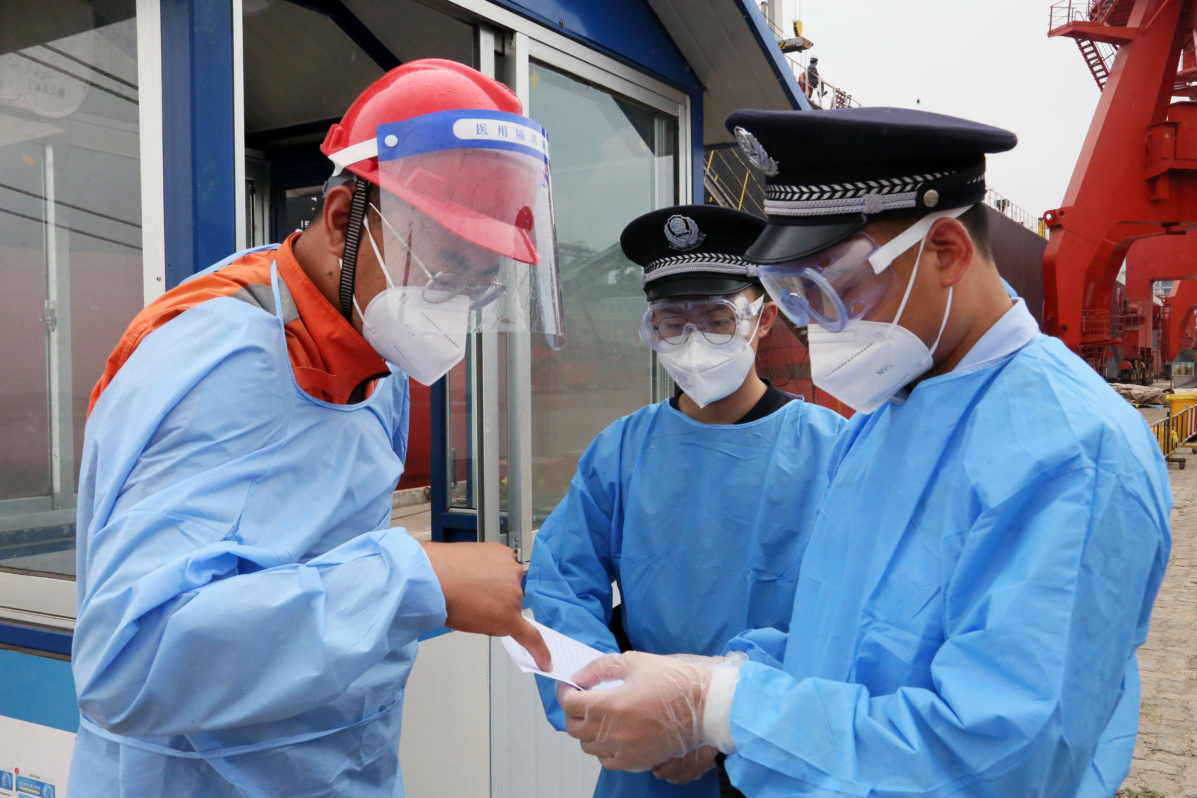 The picture shows the police understand the operation to the staff and reminds the precautions
