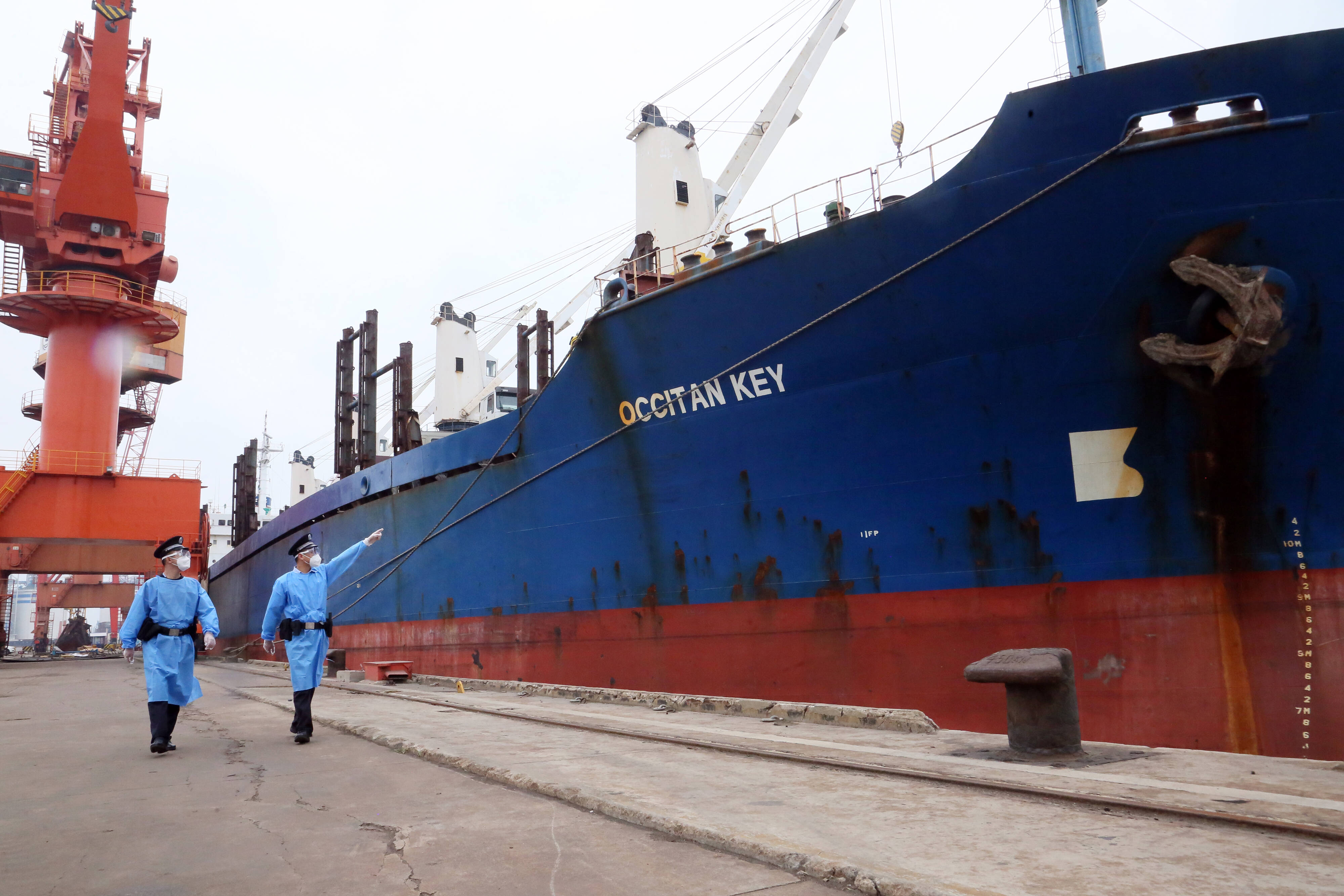 The picture shows the police informed the typhoon warning information and safety precautions to the ship crew in Hong Kong