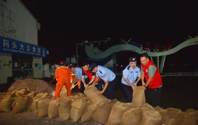 In order to prevent the typhoon and astronomical tide superimposed caused by the superimposed seawater of the snake -pier, the seawater pouring in the water, on the evening of September 13th, the Jianju Police Station of the Public Security Bureau of Sanmen County, Taizhou City, Zhejiang Province, and the party members of the Snake Township and the full -time fire brigade. A "flood prevention dam" picture/Lin Lijun was built overnight at the Wharf Wharf