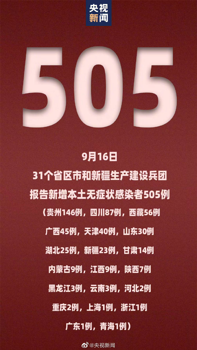 At 00-24 on September 16, 31 provinces (autonomous regions, municipalities) and Xinjiang Production and Construction Corps reported 140 newly confirmed cases. Among them, there were 64 overseas input cases (15 cases in Guangdong, 12 cases in Fujian, 9 cases in Shanghai, 7 cases in Beijing, 5 cases in Yunnan, 3 cases in Heilongjiang, 3 cases in Jiangsu, 2 cases in Tianjin, 2 cases in Inner Mongolia, 2 cases of Liaoning, 2 cases in Sichuan, 2 cases in Sichuan , 1 case of Hunan, 1 case of Chongqing), 8 cases of those who were infected from asymptomatic to confirmed cases (4 cases in Guangdong, 1 case in Beijing, 1 case in Liaoning, 1 case of Hunan, 1 case in Sichuan); 76 cases of local cases (Sichuan 34 cases, 10 cases in Tibet, 8 cases in Guizhou, 5 cases of Tianjin, 4 cases in Guangxi, 3 cases in Inner Mongolia, 3 cases in Guangdong, 2 cases in Hainan, 2 cases in Chongqing, 1 case in Yunnan, 1 case in Shaanxi, 1 case in Xinjiang, 1 case ), 17 cases of those who were infected from asymptomatic to confirmed diagnosis (15 cases in Sichuan, 1 case in Tibet, 1 case in Xinjiang). There are no new death cases. No new suspected cases.
