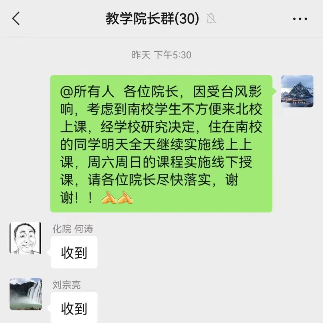 In order to coordinate the prevention of typhoons and education and teaching, the school adjusted the learning methods of all students living in the South Campus to online in the afternoon of September 15th. On September 16th The arrangement will be adjusted according to the weather conditions.