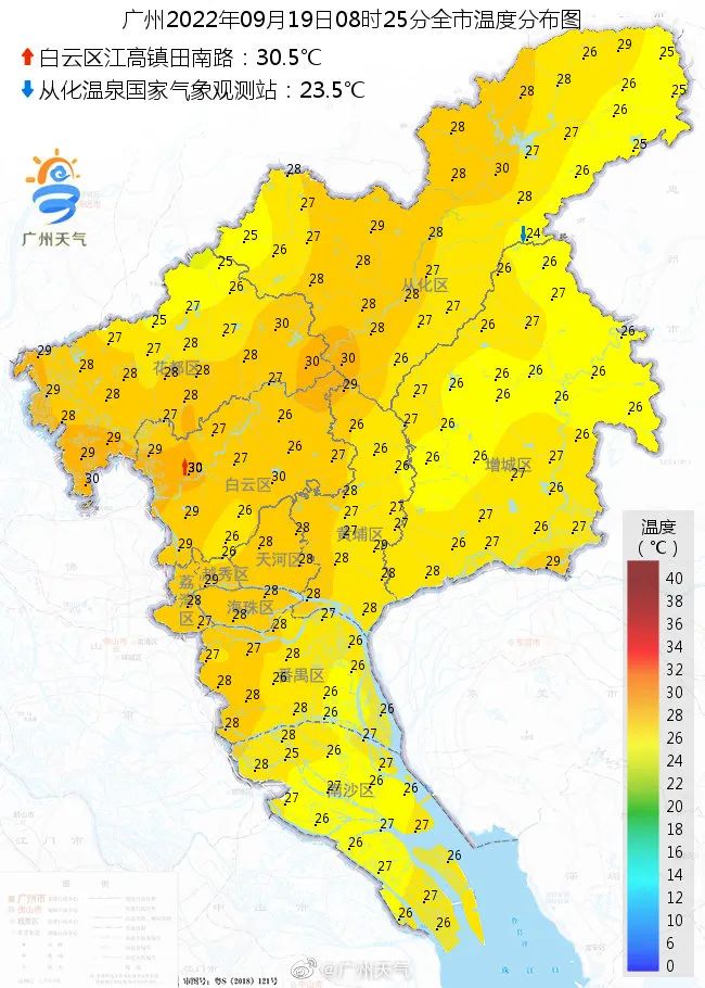 Looking forward to September 21, due to the influence of weak and cold air, most of Guangdong's highest temperature has declined. The south coastal cities and counties are 29 ° C to 32 ° C, and most of the remaining cities and counties are 32 ° C to 34 ° C.