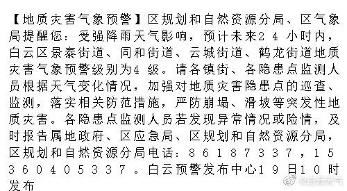 The Baiyun Early Warning Release Center issued a geological disaster meteorological warning at 10:00 on September 19: Affected by heavy rainfall weather, it is expected that in the next 24 hours, the Geological Disaster weather warning level of Jingtai Street, Tonghe Street, Yuncheng Street, Heilong Street, Baiyun District is level 4.