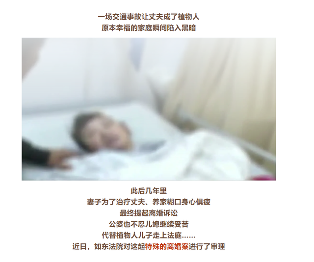 On September 25, the East Court announced a divorce case. In 2018, her husband, Mr. Cao, became a vegetative due to a car accident, and his wife went out to work. The in -laws took care of her husband and grandson at home. A few years later, the husband still did not improve, and his wife gradually had the idea of divorce. The in -laws could understand but could not bear to make a decision for their son, and hoped to be sentenced to the court's decision.