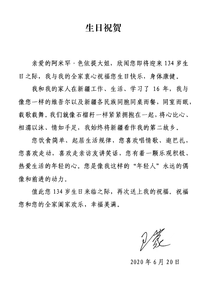 However, at this time, the famous writer Wang Meng sent "Birthday Congratulations" to Almyhan: my dear Sister Almy Handei Sister, I heard that when you are about to usher in the 134th birthday, I and my family and my family are about to usher in my family. I sincerely wish you a happy birthday and good health.