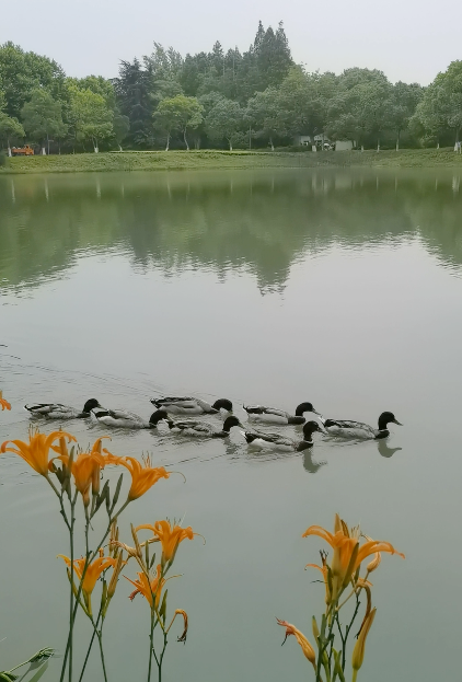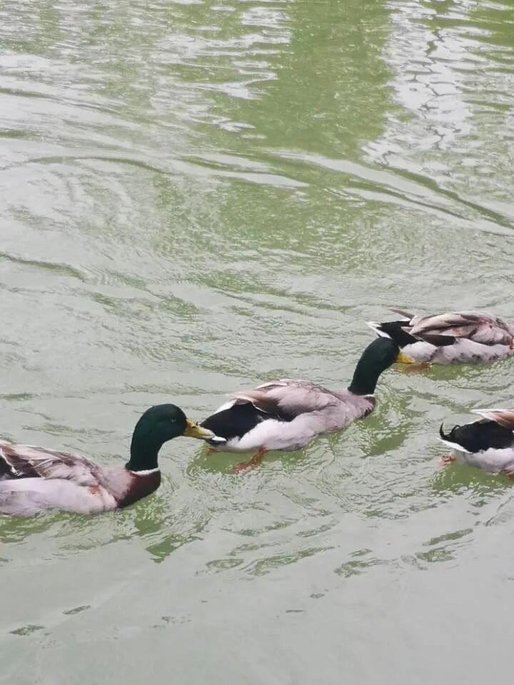 I saw that the seven cute green -headed ducks played the water happily in the water, the feathers were soft and oil, and then pierced into the water. After a while, the water surfaced, shaking the tail, and shaking off the water droplets. Although some people are around, they don't care, they are free to swim on the green water, and even have a queue shape, a group of little fish surrounds the surroundings.